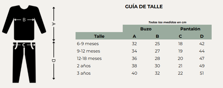 Disponible en 5 talles que van desde los 6 meses hasta los 3 años, este conjunto es ideal para acompañar el crecimiento de tu pequeño. ¡Una elección perfecta para cada día! 🌟